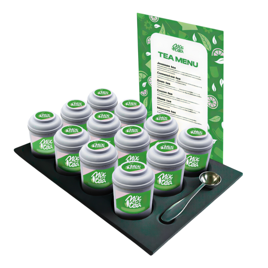 Looking for a beautiful tea tray to showcase your blends? This sleek black display tray is available in 4, 6, and 12-slot versions — perfect for presenting your teas in style. Combine it with matching tins in black or white for a complete, elegant setup.